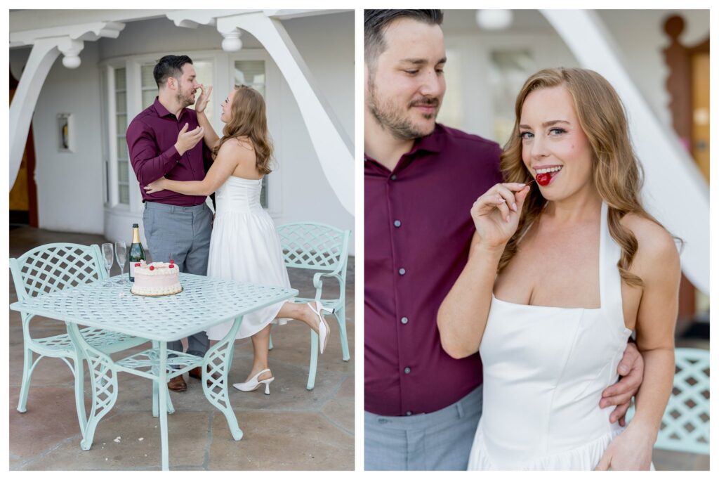 If you’ve ever dreamed of an engagement session that feels straight out of a dreamy, vintage love song, this Madonna Inn Wedding San Luis Obispo inspired shoot is exactly what retro romance looks like in real life. Everything about this day was pure magic, from cherry-topped cakes to heart-shaped railings and cheeky wallpapered hallways. Imagine Lana Del Rey meeting mid-century California charm, with a healthy dose of playfulness and glamour woven in.