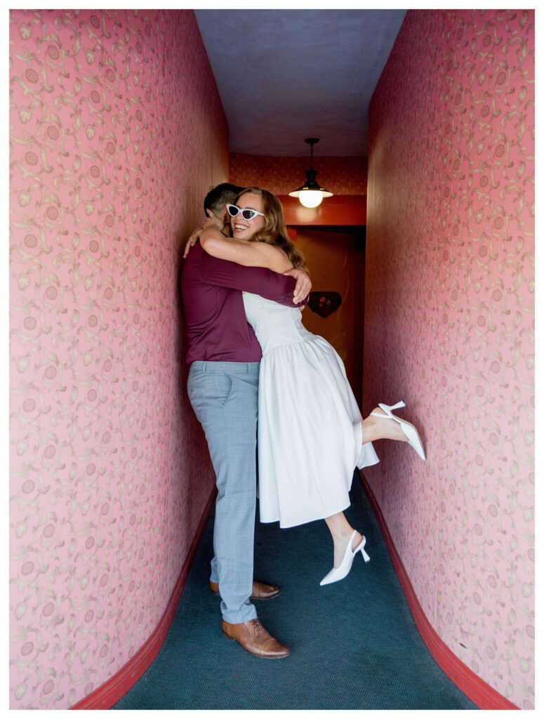 Throughout their session, the couple wandered from room to room, laughing, dancing, and sharing quiet moments. From cozy corners with vintage charm to bold, floral backdrops, every photo felt effortlessly romantic. They even snuck in a kiss beneath the inn’s ornate white arches—a moment that looked like something straight out of a retro rom-com.